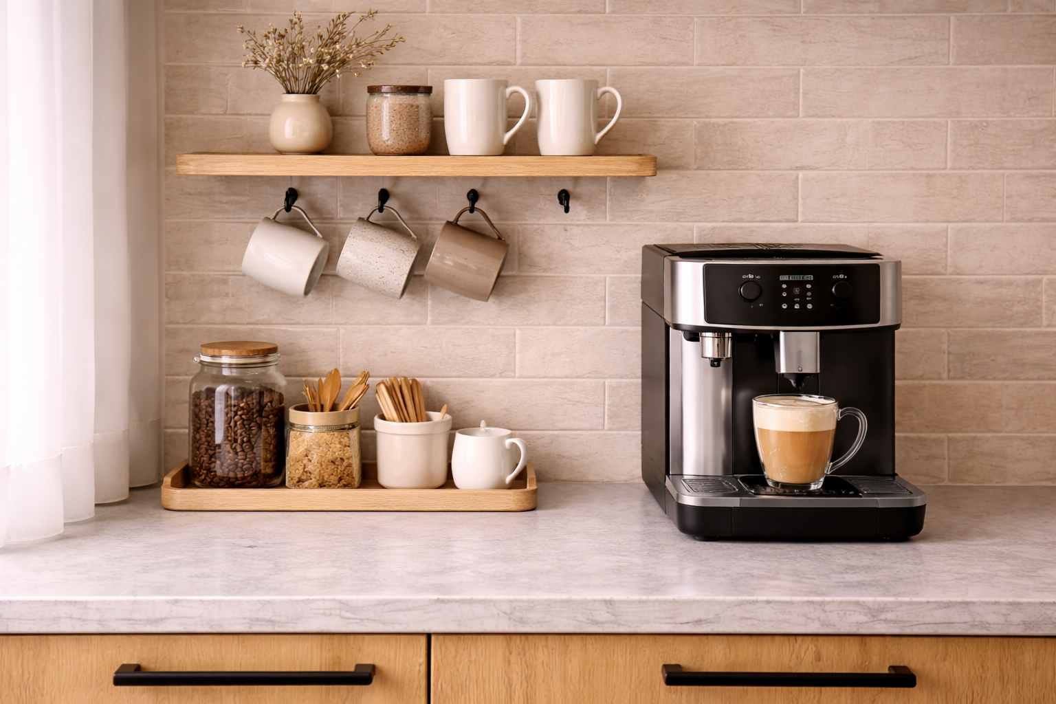 Een koffiecorner is een vaste plek voor je “koffieritueel”: koffie/thee, water, mokken, lepels, melk/suiker (als je dat gebruikt), en vaak ook een klein afvalpunt. Het voordeel is simpel: